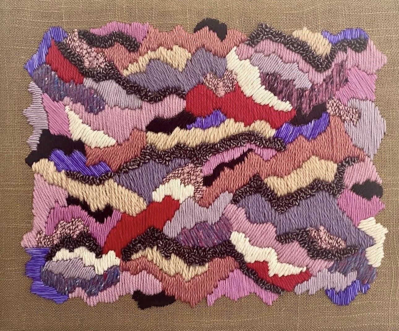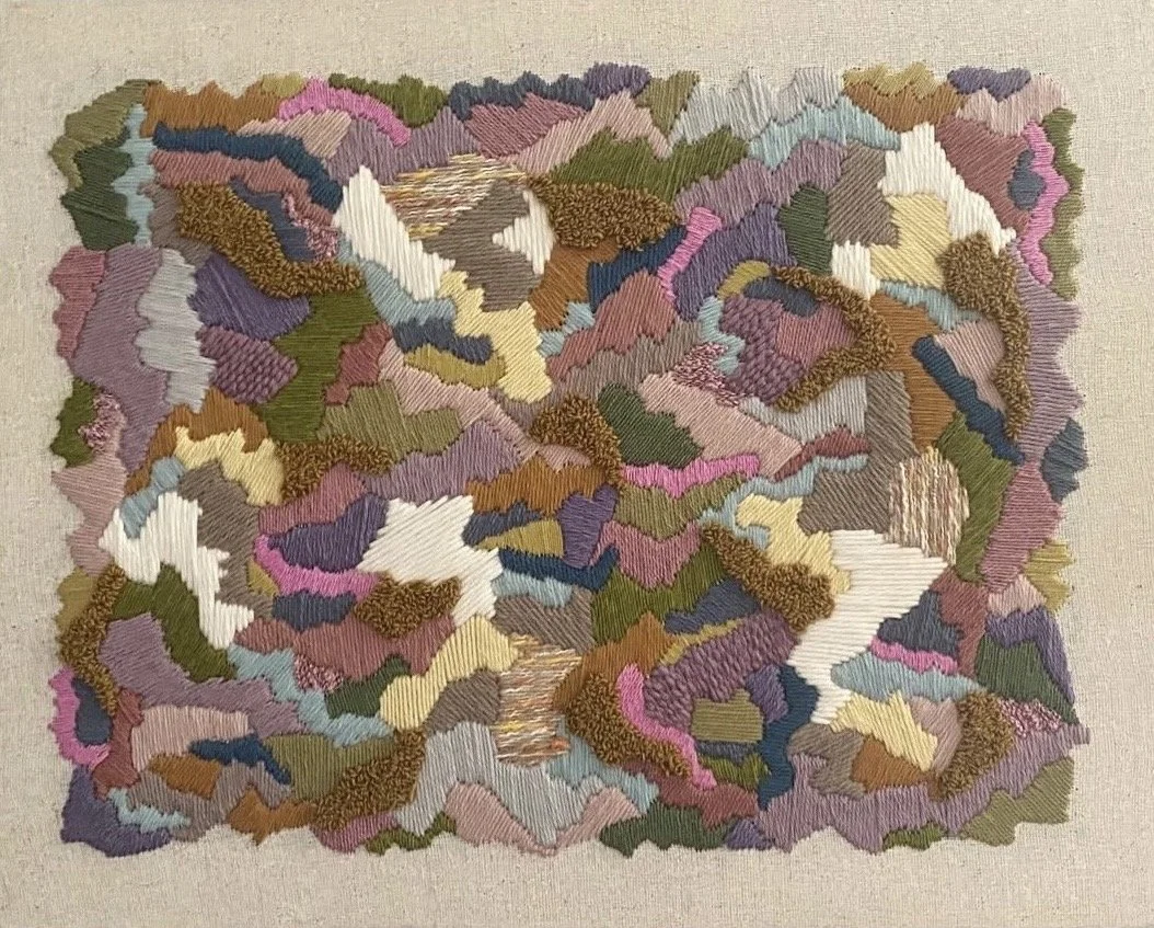 My work explores texture, color, and the space between the familiar and the abstract. I primarily work in fiber art, creating abstract embroidery pieces that invite close, contemplative viewing. I also enjoy experimenting with watercolor, collage, and mixed media, allowing each piece to evolve organically and respond to the materials themselves.