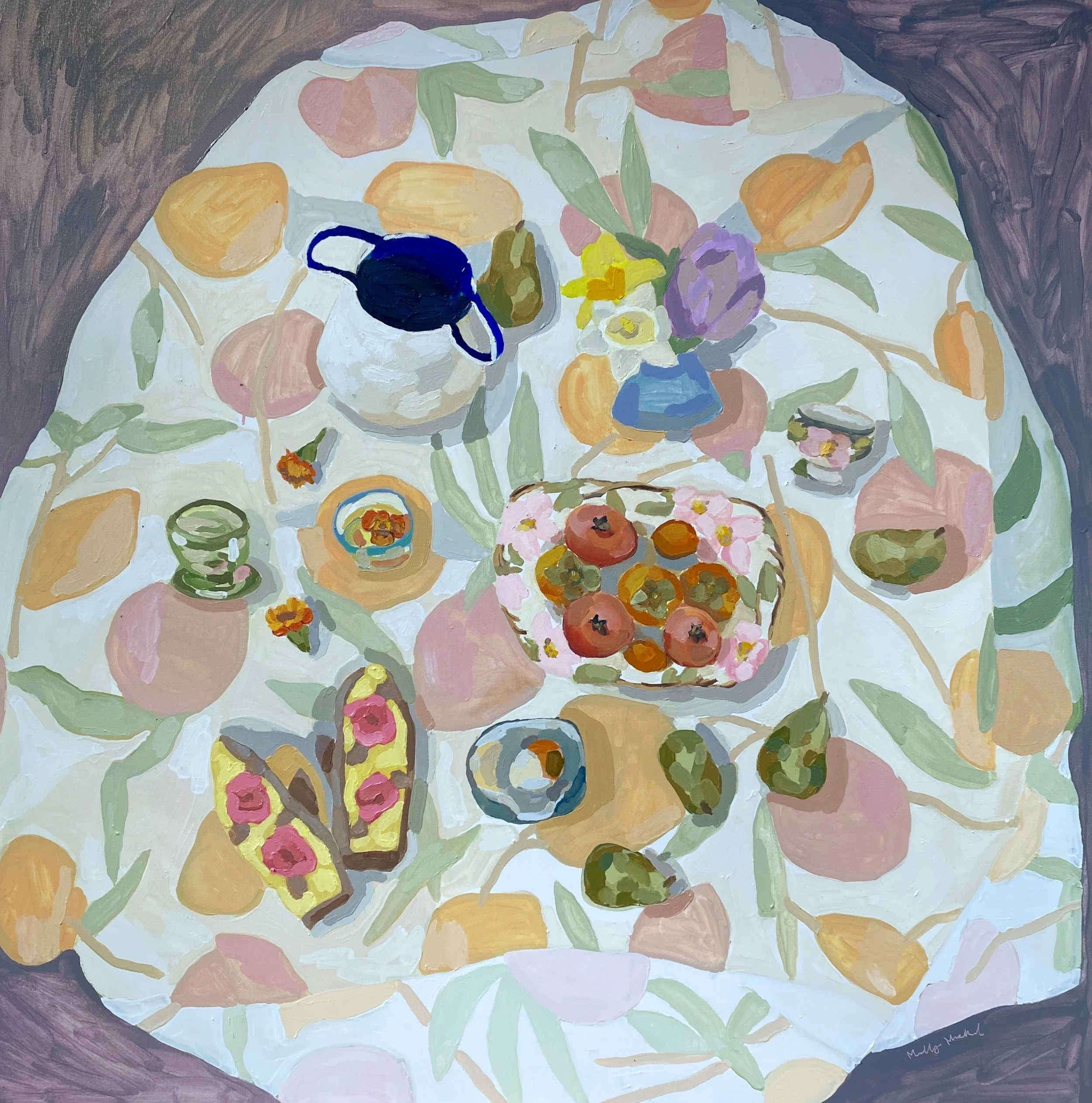 The table, central to my still lifes, is a symbol of community, sharing, and care, highlighting the roles women have traditionally played in nurturing and sustaining communities and families. It serves as a metaphorical space where women’s stories, struggles, and contributions, are celebrated.